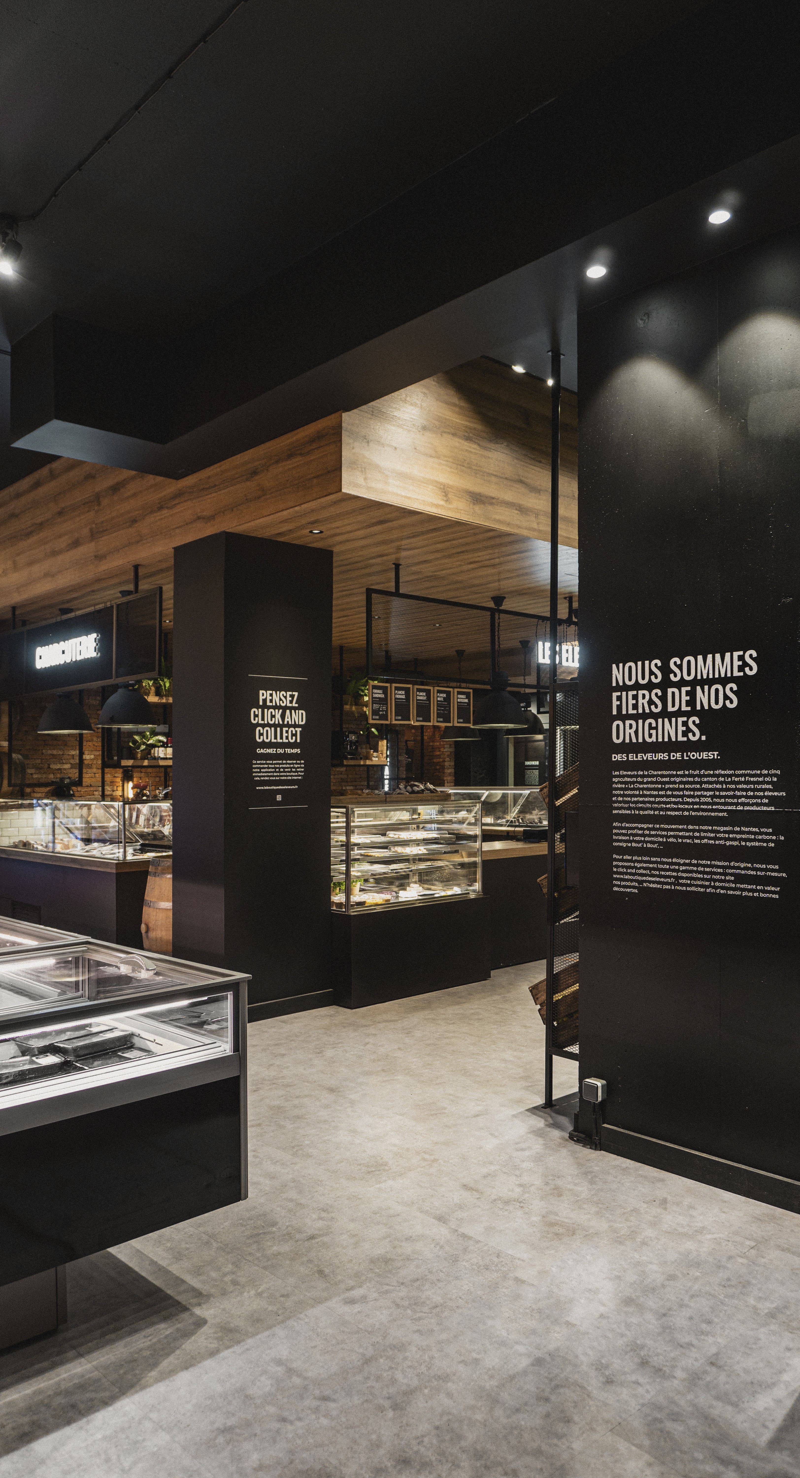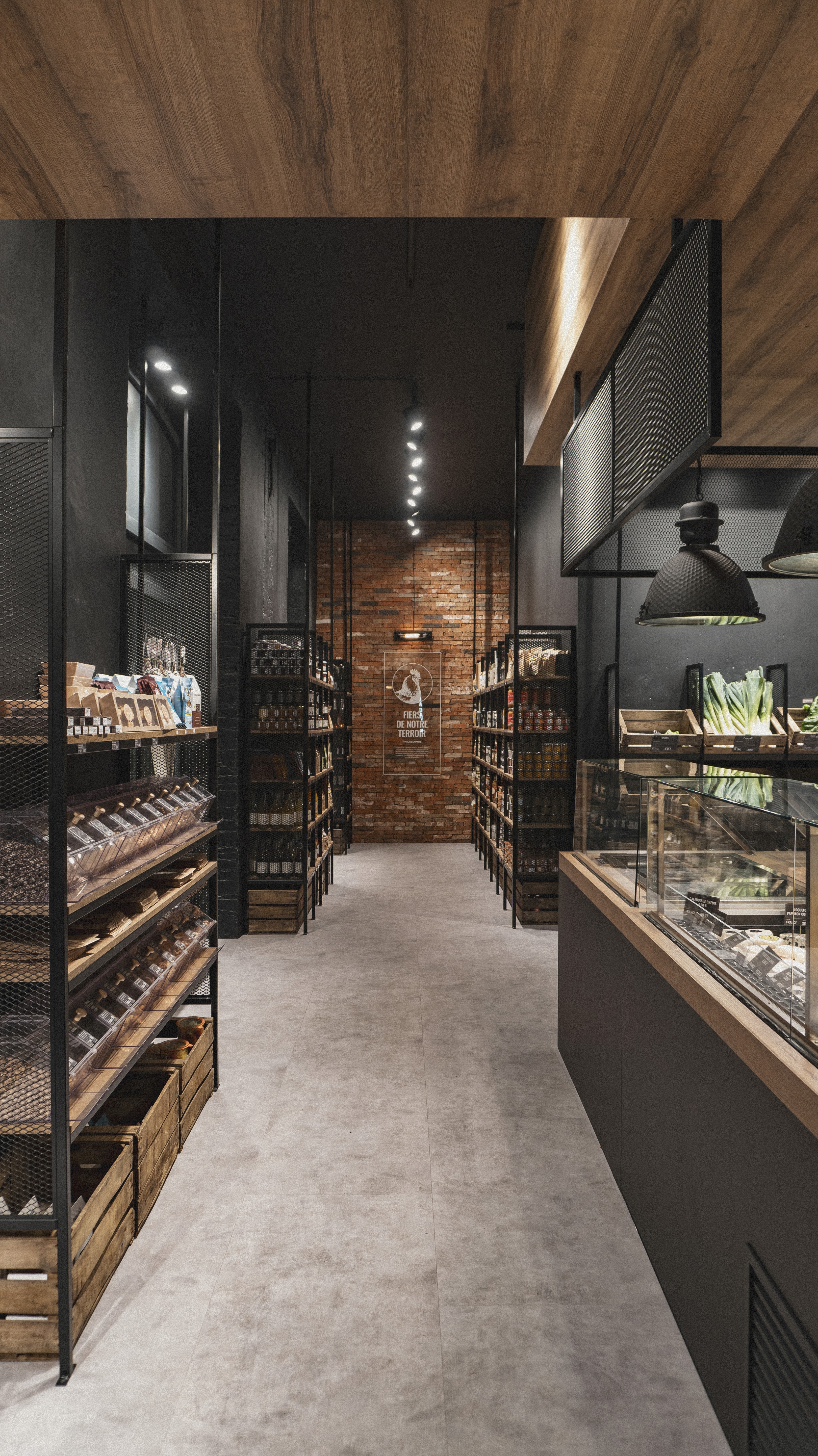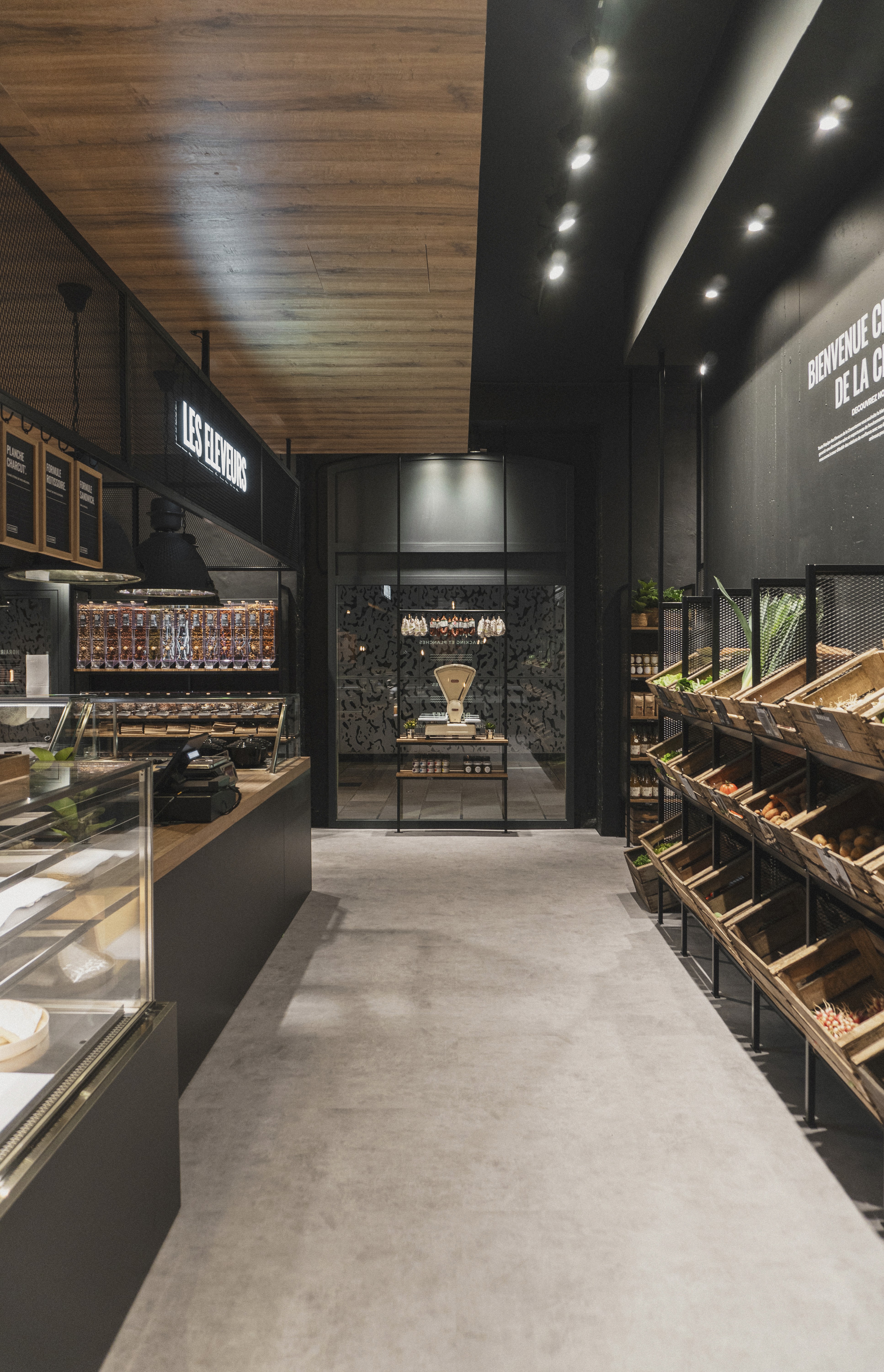 Le rez-de-chaussée s’articule autour d’un pôle central dédié à la coupe (fromagerie et charcuterie), véritable cœur battant du magasin, complété par une zone boucherie en libre-service, un espace primeur et une épicerie fine. En sous-sol, nous avons imaginé une cave de caractère, pensée comme un écrin confidentiel autour d'un espace de dégustation, invitant à la découverte et à l'échange. Un agencement sur mesure qui allie efficacité commerciale et esthétique premium.