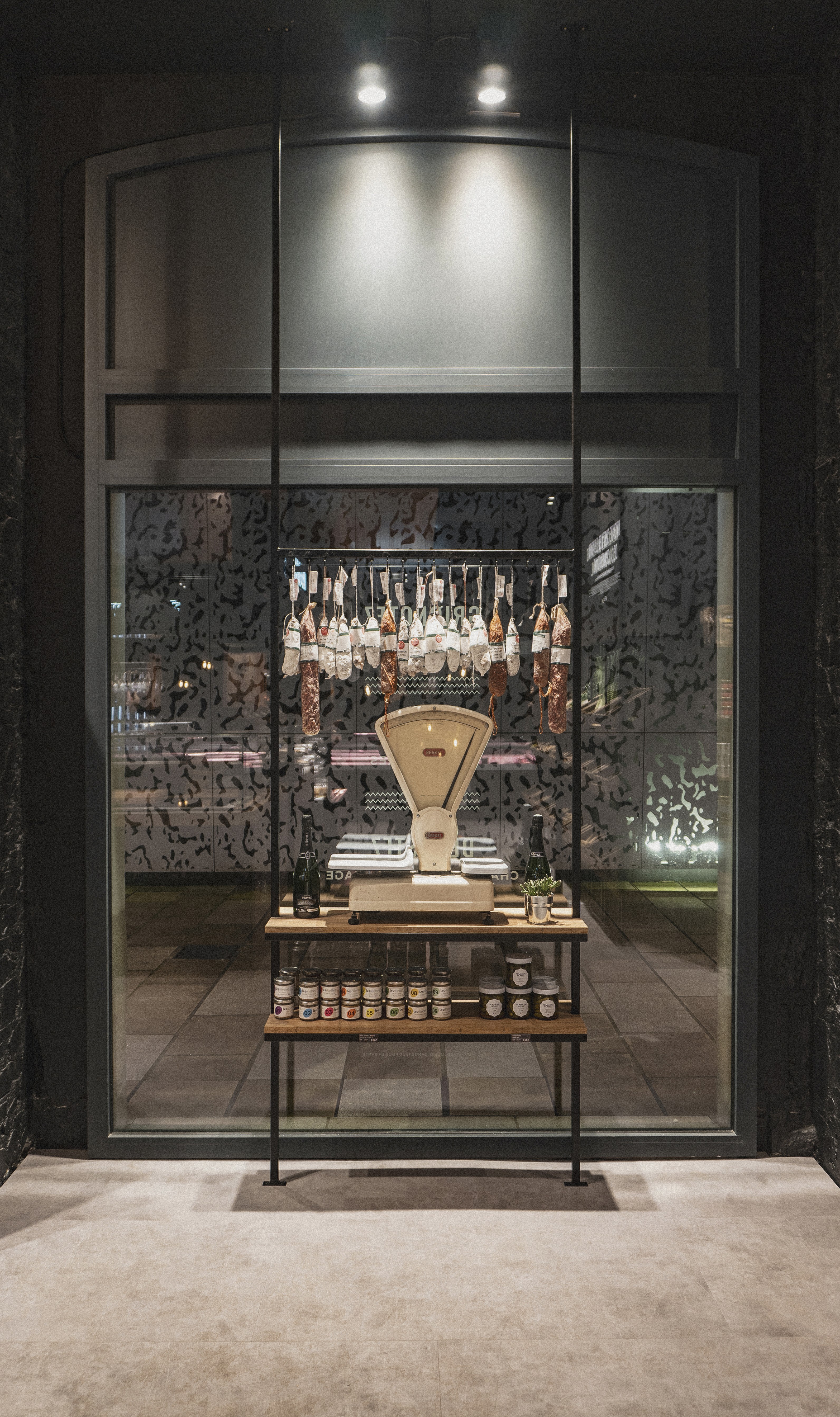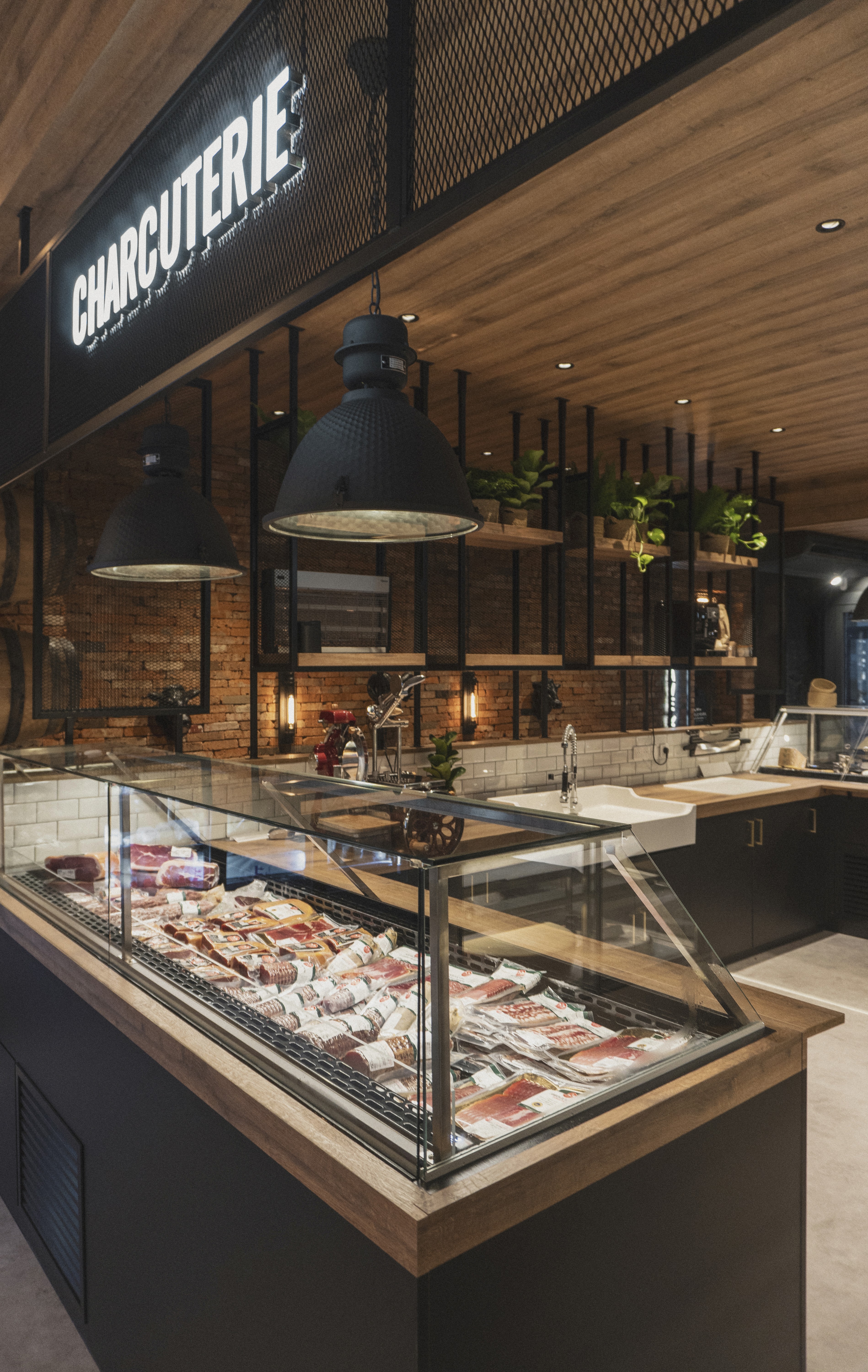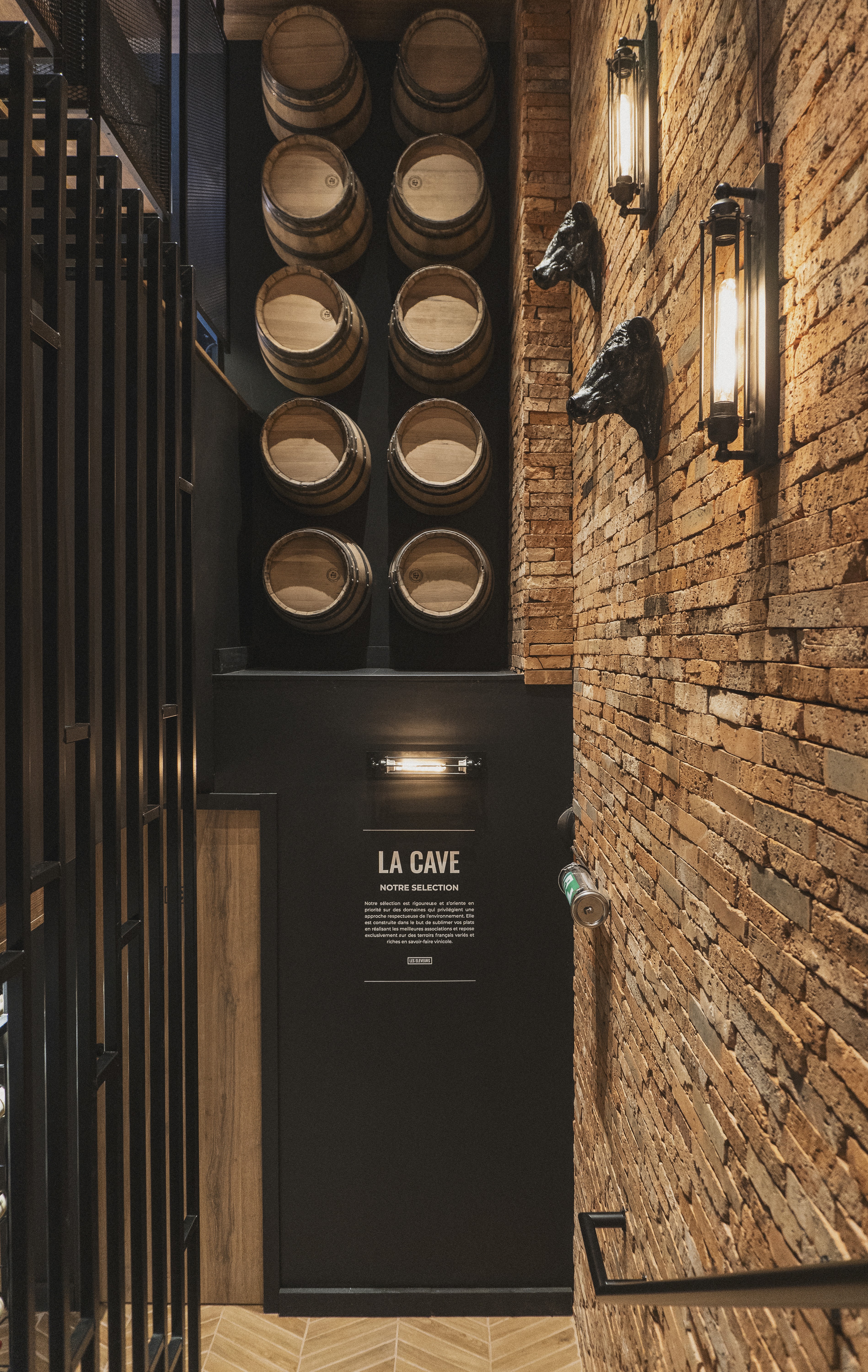 Le rez-de-chaussée s’articule autour d’un pôle central dédié à la coupe (fromagerie et charcuterie), véritable cœur battant du magasin, complété par une zone boucherie en libre-service, un espace primeur et une épicerie fine. En sous-sol, nous avons imaginé une cave de caractère, pensée comme un écrin confidentiel autour d'un espace de dégustation, invitant à la découverte et à l'échange. Un agencement sur mesure qui allie efficacité commerciale et esthétique premium.