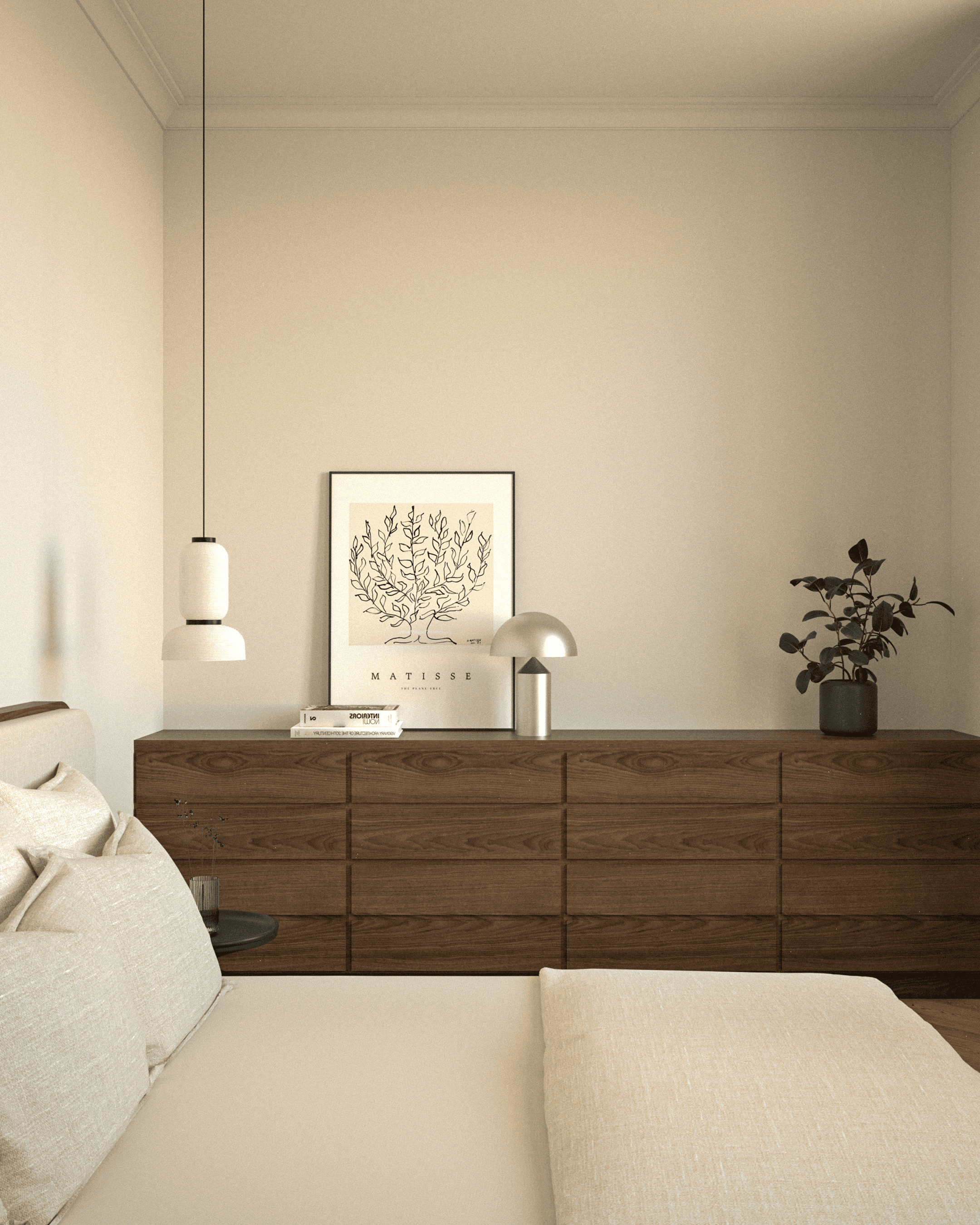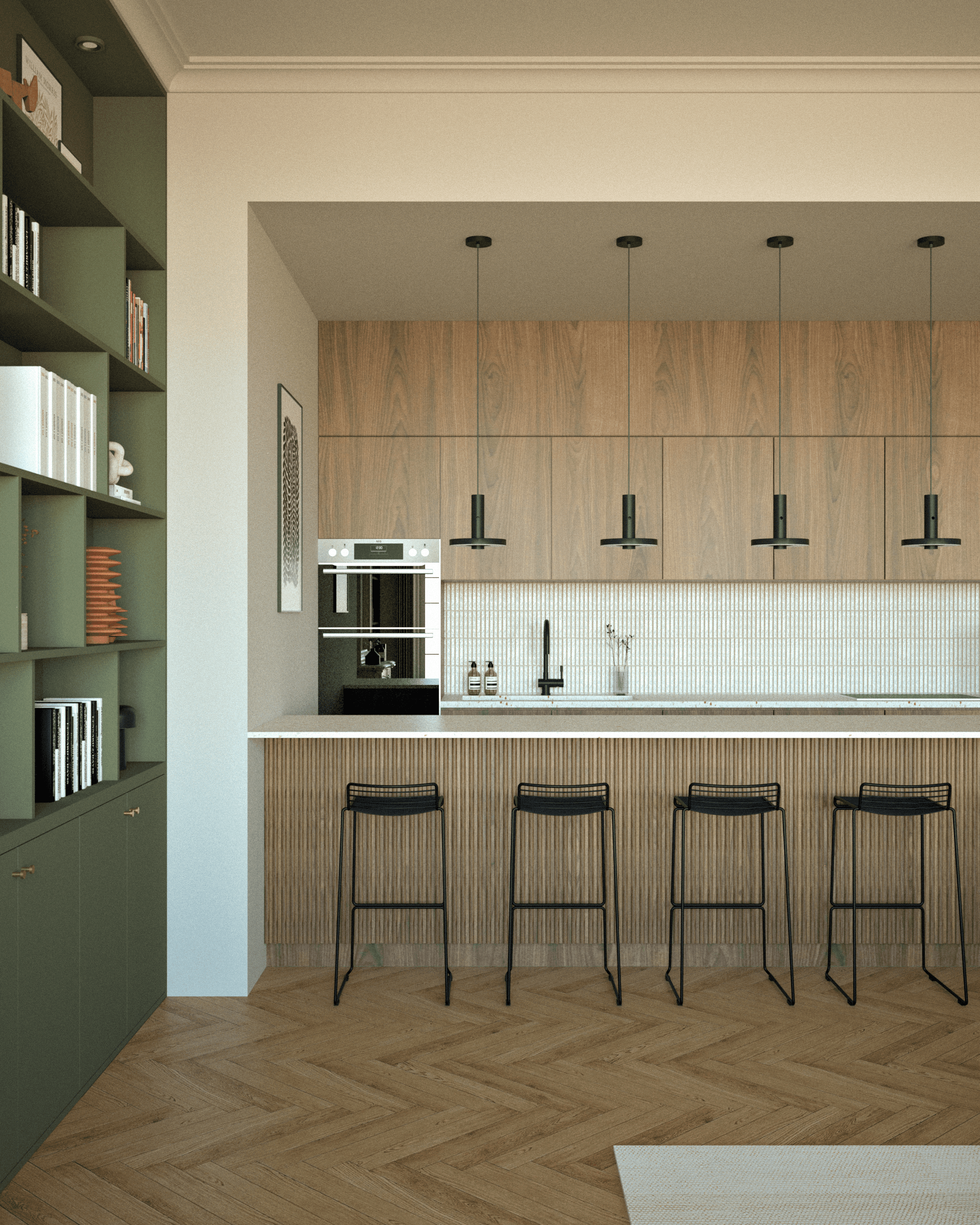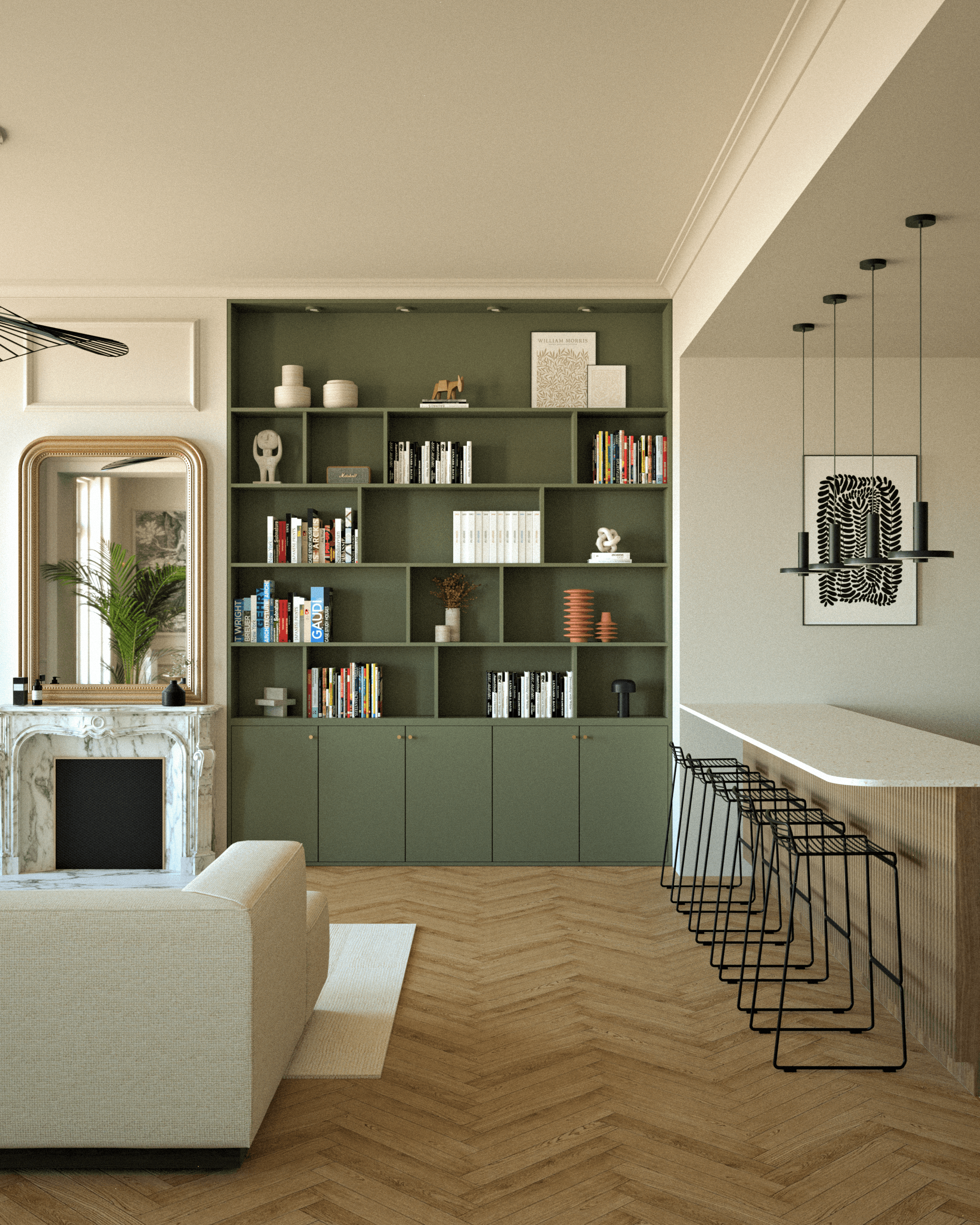 L’esthétique développée marie classique et modernité. Les menuiseries sur mesure structurent l’espace et créent une continuité visuelle apaisante. Les matériaux nobles, parquet en chevrons, marbre et noyer, dialoguent avec un vert profond et un ocre doux. Les textures travaillées et les accents de métal noir ponctuent l’ensemble, aboutissant à un intérieur harmonieux, raffiné et intemporel.